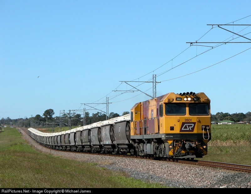 | Class Leader QR 2801 powers up the grade at Medowvale on the North Coast Line with Grain Train #Y327 - QR 2801 has been a Mt Isa Line Locomotive for many years and has just recently started hauling trains on the North Coast Line |