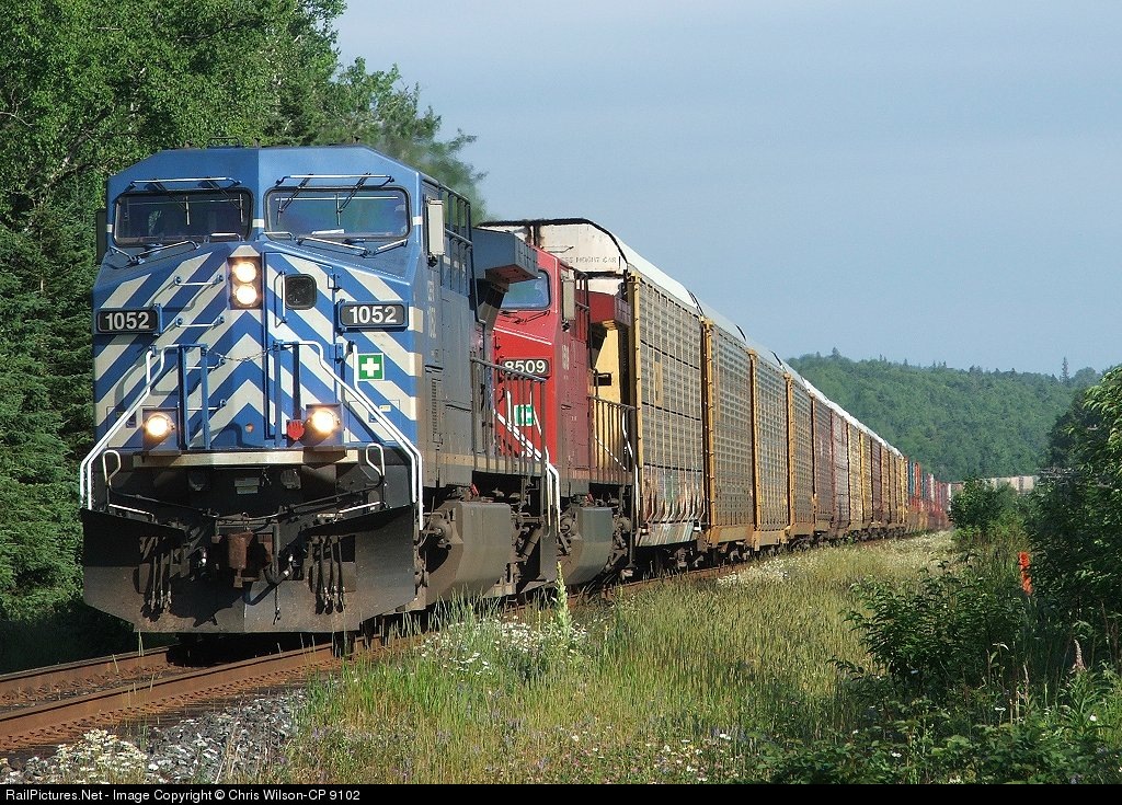 | CP #101-CEFX 1052, CP 8509, 13 h/e autoracks, intermodal-352 axles @ 17:55 ~ stop before the homeboard for CP #120 |