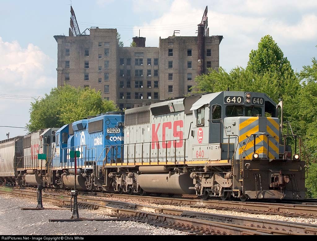 | SHME led by KCS 640, NS 3020 (x-CR GP40-2) and KCS 711 through the CN Switch Tender. IN the background is the King Edward Hotel, recently bought by Duece McAllister and to be renovated. |