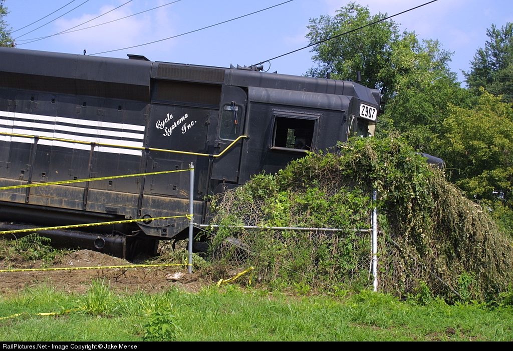 | Oops! A Runaway GP30 and gondola rolled out of Cycle System's facility near Wonju Street and crashed through the fence. The GP30 now hangs over the road with the fence still attached! |