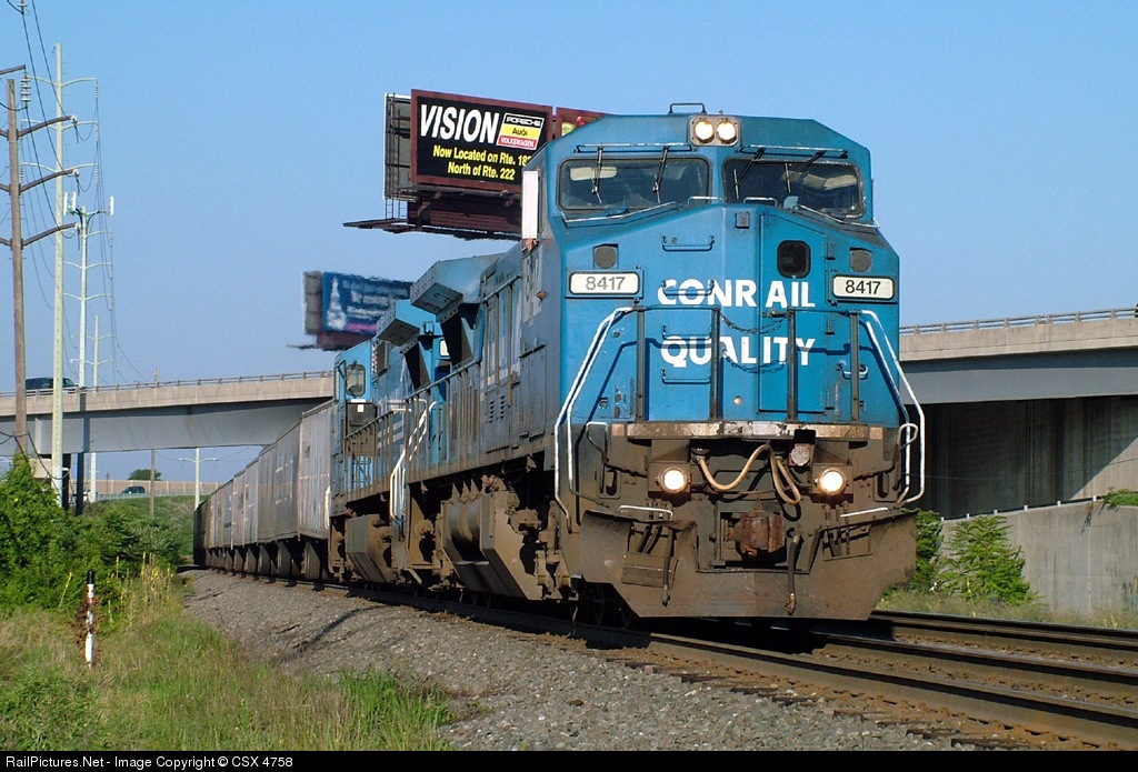 | Former Conrail Q unit strikes a pose in the early morning at Wyomissing. Another CRQ dash 8 is assisting the 8417 in pulling the roadrailer train eastward to Bethlehem via the NS Harrisburg Line, then the Reading Line. |