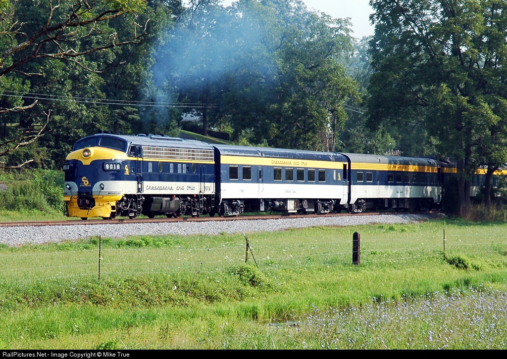 | One of the former Clinchfield F7's is repainted to represent C&O F7A 8016 with a C&OHS Convention Special on the South Branch Valley Railroad. The C&O F7 units were orginally numbered 8000 - 8015. This unit is numbered one above the orginal class. |