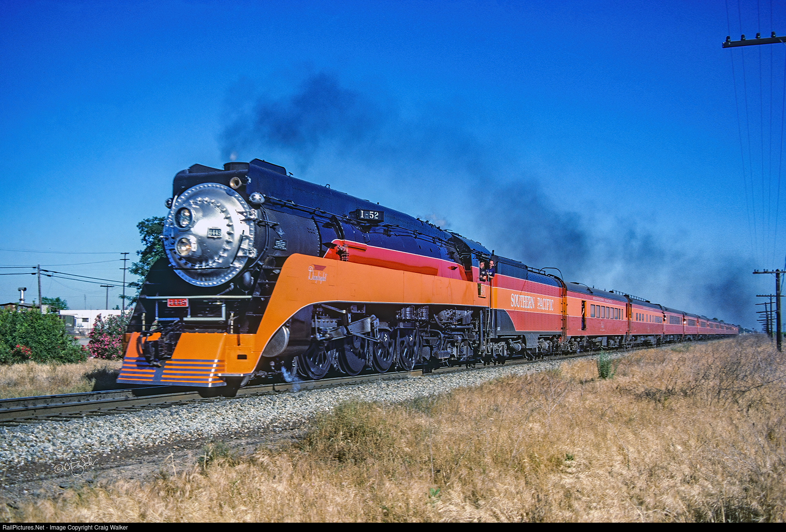 The World's Fair Daylight stretches her legs as she speeds southward (railroad east) down California's breadbasket, the San Joaquin Valley. The Lima-built 4-8-4 was constructed for the Southern Pacific's famed Daylight trains, and is now owned by the city of Portland, Oregon. (Fowler, California – May 12, 1984)