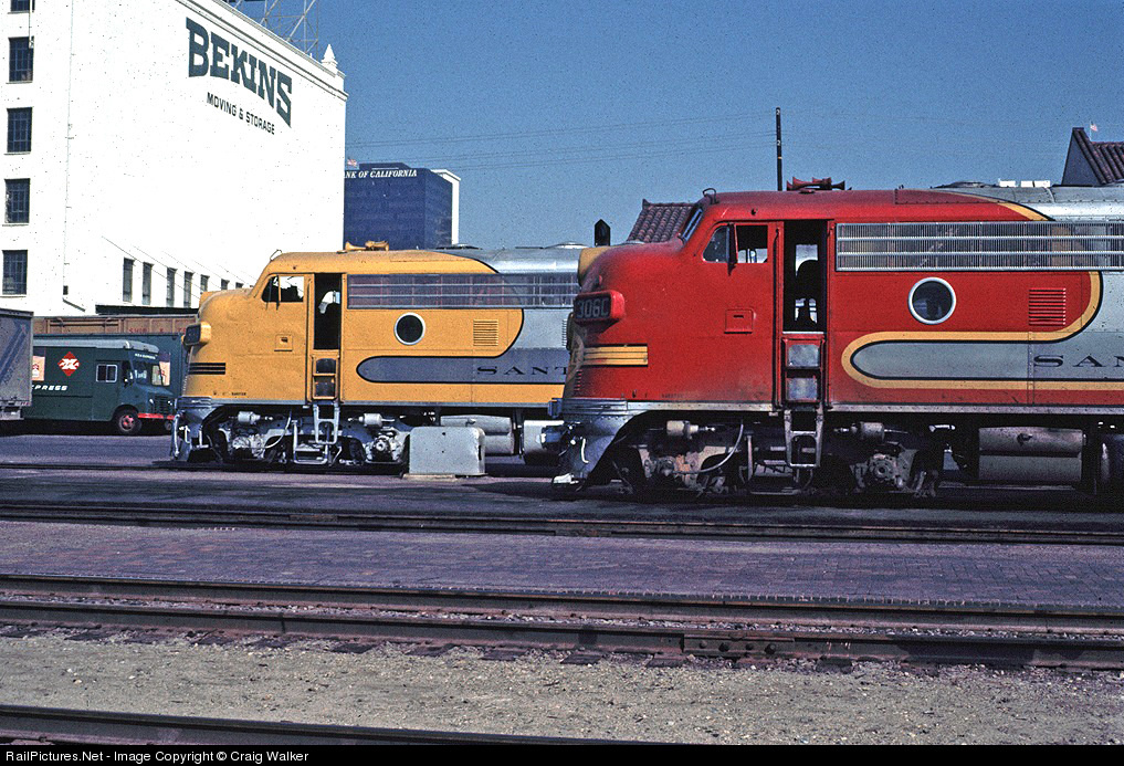Santa Fe F7As 304L (in Yellow Warbonnet) and 306C (in the traditional Red Warbonnet) lay over in San Diego waiting to hustle westbound Amtrak San Diegans north to Los Angeles.