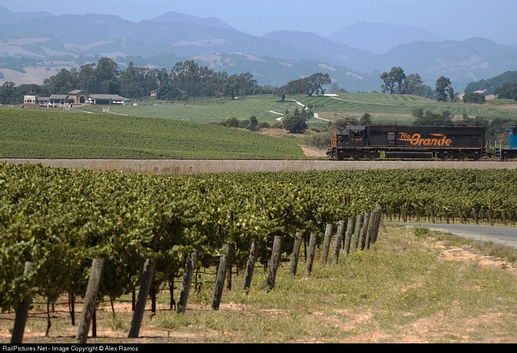 | The last unpatched DRGW SD50 is seen here hauling the Suisun to Napa train through the Napa Vinyards, in the backround is a golf course. Nikon D70, 70-200mm. www.bayarearailroading.com |