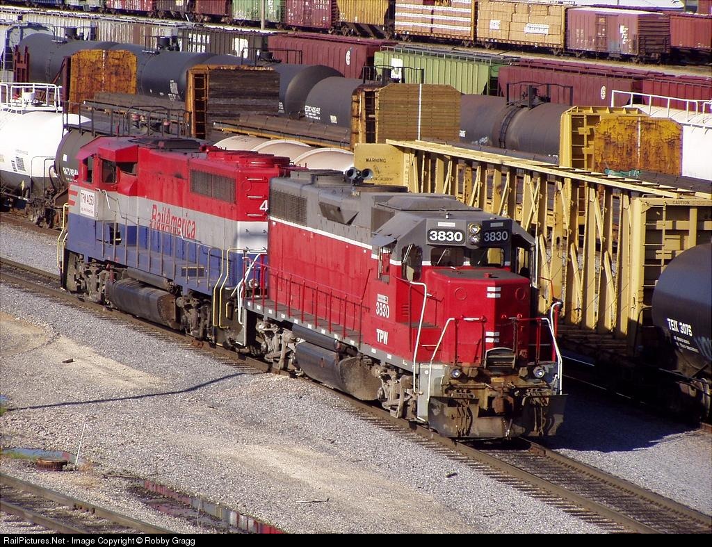 TP&W GP38 3830, still in its Central Oregon & Pacific paint and TP&W GP40-2W Canadian Cab 4053 head light through Galesburg Yard