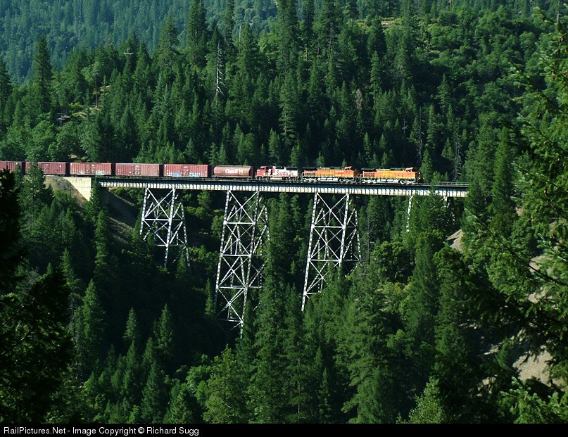 Two BNSF C44-9W's and a Warbonnet GP60M lead a southbound manifest across the the big trestle just north of Keddie in the late afternoon.