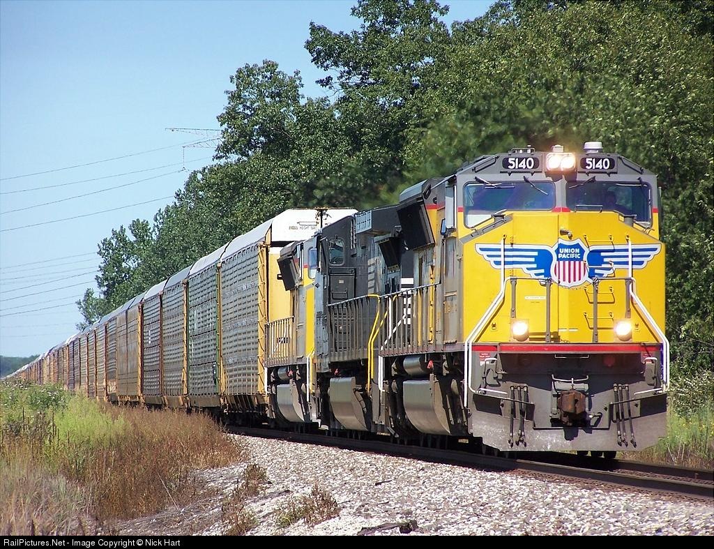 A clean UP SD70M 5140, an NS Dash 9 and another UP SD70M slowly lead a Westbound Autorack through Coal City.