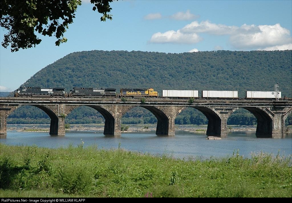| Westbound On Bridge With Engines , NS 8343 , BNSF ( Ex Santa Fe ) 8719 , Rare To See One Of The Old Blue & Yellow Engines! |