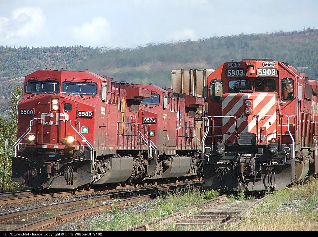 | CP #108-CP 8580, 9576, intermodal-372 axles @ 10:45 CP 5904 & 5924 (train WHB) are doing culvert work all over the Heron Bay sub. |