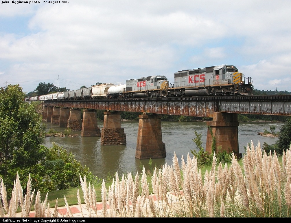 | NS 136 crosses the Chattahoochee River bridge as it arrives in Columbus, GA (Phenix City, AL is on the other side of the river); the two KCS units were second and third out on the previous day's 137 (photo 116786) |