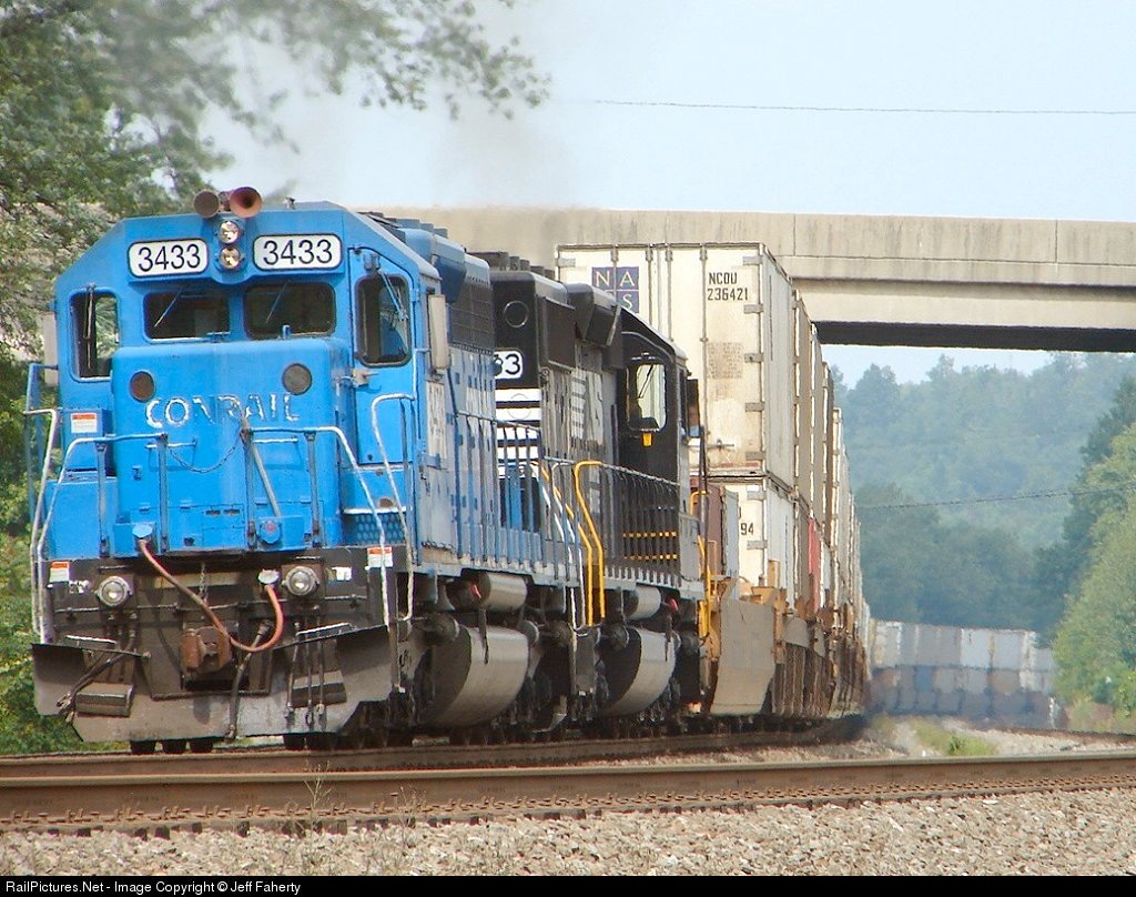 The Conrail on the nose may be faded but the blue still stands strong as this locomotive helps push an eastbound intermodal upgrade.