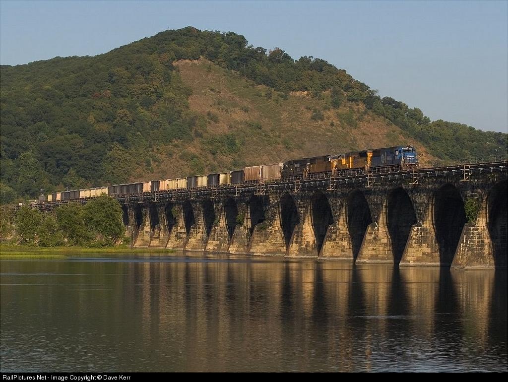 With two UP and one NS loco trailing, CR Blue leads stone train H68 westbound across Rockville Bridge today at 17:20. Tripod-mounted Canon 20D and 70-200mm lens, 1/400 sec. exp, f8.0, ISO 100.