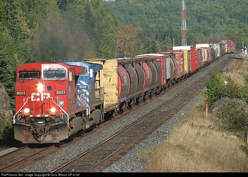 | CP #115-CP 8601, CEFX 1028, 53 mixed, 64 intermodal platforms-464 axles @ 16:35 |