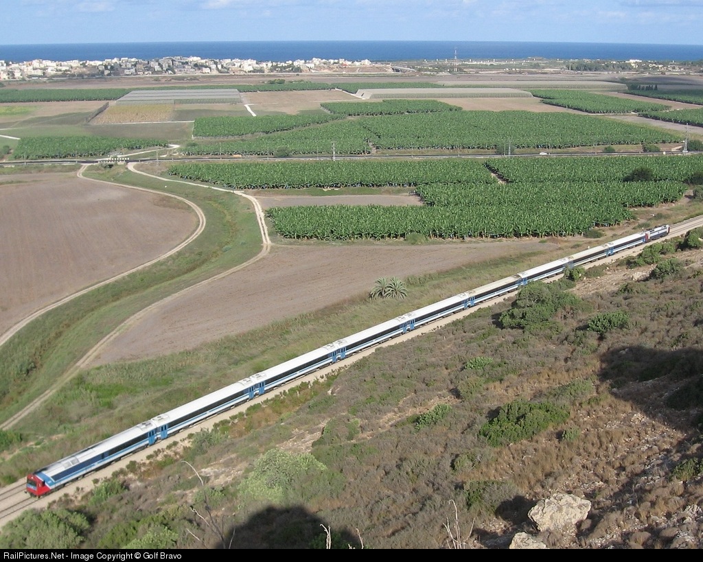Service from Nahariyya to Ben-Gurion International Airport. In the background the small village of Jaser-a-Zarka, on the coast of the Mediterranean Sea.