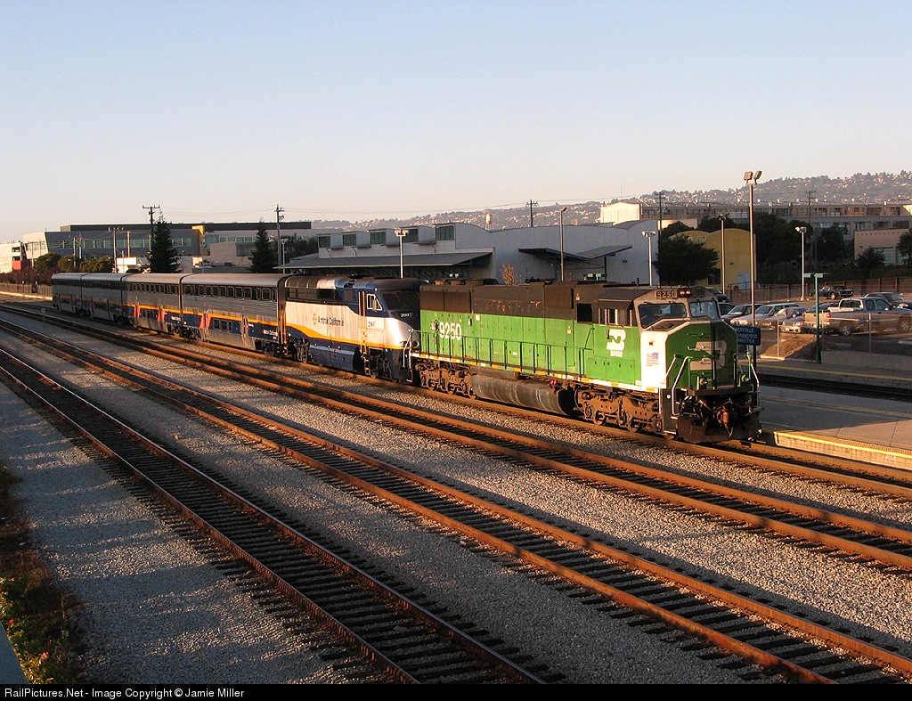 | Heading back to the BNSF, after being used for emergency power, BN 9250 pushes on the rear of San Joaquin # 718 at Emeryville. |