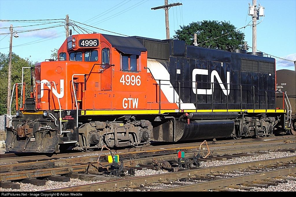 | CN/GTW 4996 at Wallace yard. It is currently the Freeport yard engine, also known as the FURBALL. The FURBALL runs everyday except on Sundays. It switches places such as Atkins Energy ethanol plant in Lena and a grain elevator in Seward. |