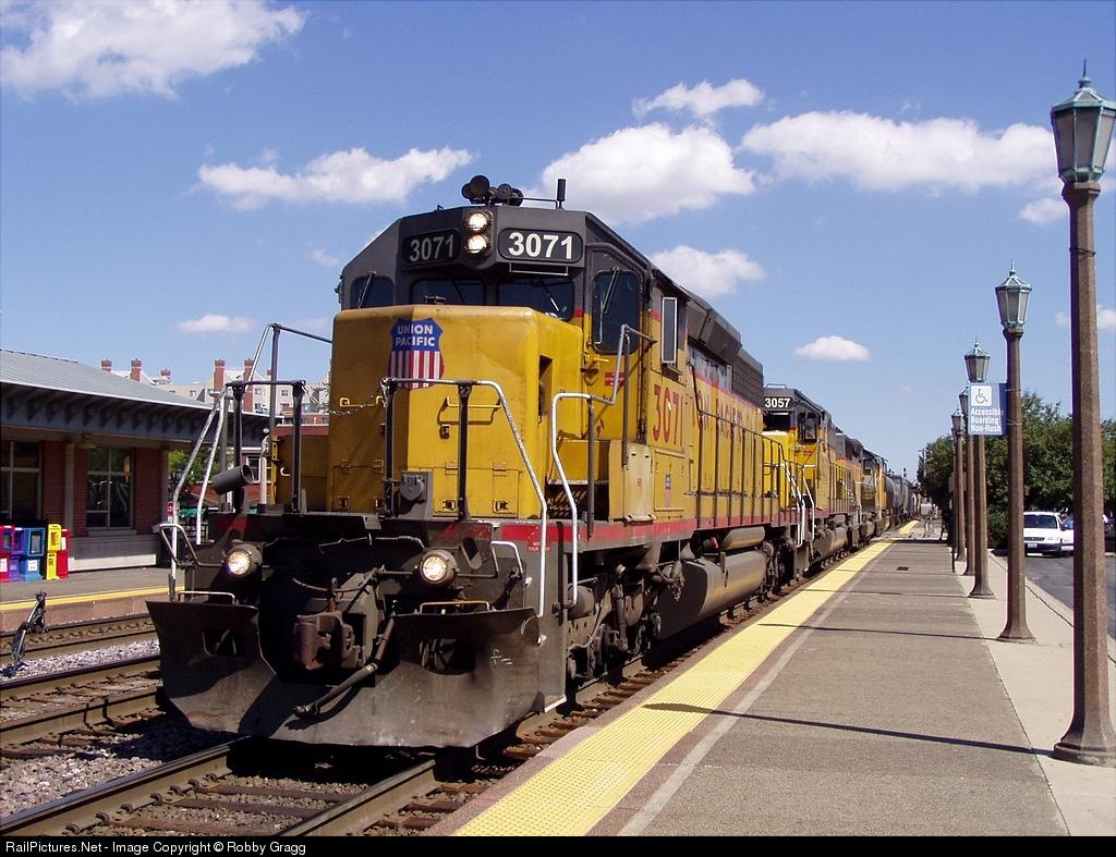 | UP SD40-2 3071, 2 more UP SD40-2s, and a UP SD70M head Westbound with a manifest through Elmhurst. |