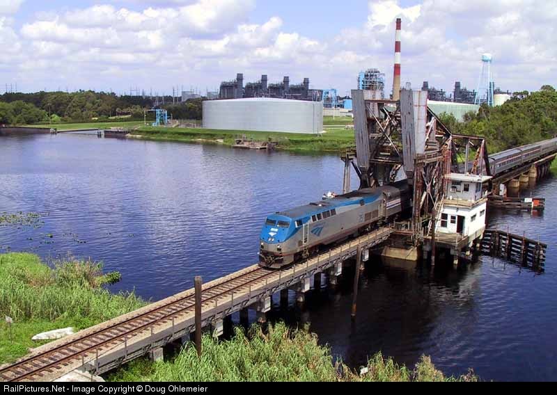 Southbound Amtrak No. 91 crosses the Lake Monroe St. Johns River drawbridge at DeBary, Fla., en route to Sanford, Fla., and Orlando and points south. Digital image.