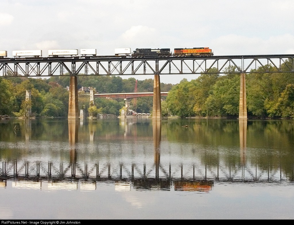 BNSF power leads this NS train north into Maryland. In the distance in the water the remnants of the former roadway bridge are visible. Earlier crews blasted the old bridge and the structure fell into the water.