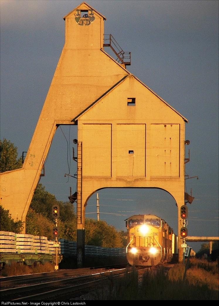An empty coal train ducks under the DeKalb coaling tower just as the sun sets.