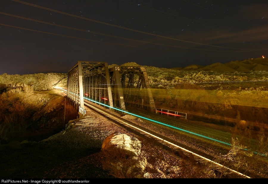 Eastbound Amtrak train #4 sprints across the Mojave River near Victorville on the Cajon Sub on a chilly December night.