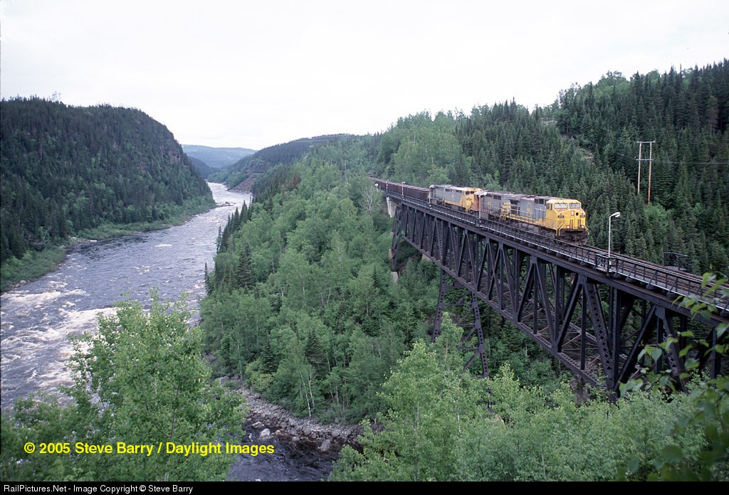 Southbound QNSL train crosses the Moisie River Bridge near Milepost 12 north of Sept Isles, Quebec.