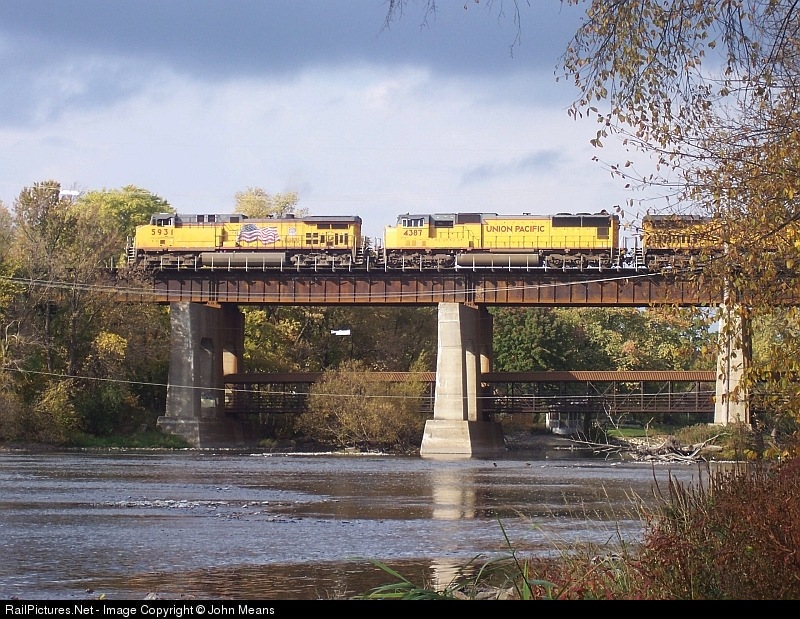 UP 5931 is the leader of just another fleeted westbound over the Fox River, westbound into Geneva.