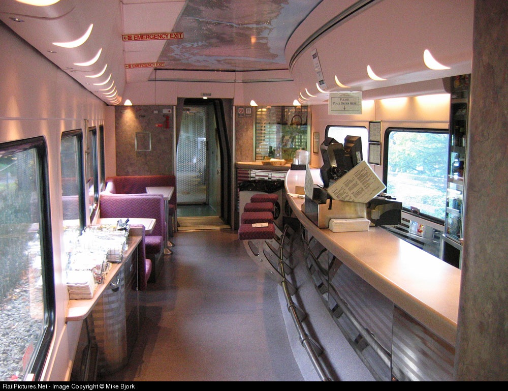 The Bistro car of the Amtrak Cascade Talgo trainset. Note the ceiling and huge windows. A nice place to sit, enjoy a soda, and watch the Sound go by...