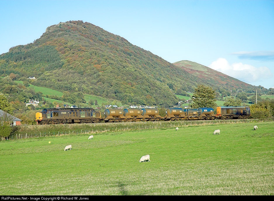 | With Moel-y-Golfa and Middletown Hill in the background, 37608 + 20305 pass Trewern on the Machynlleth leg of the circular 1Z96 13.24 Crewe Gresty Lane railhead treatment train. |