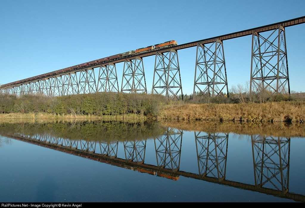 Eastbound BNSF 5353, 4963 on a grain train crossing the Valley City treastle
