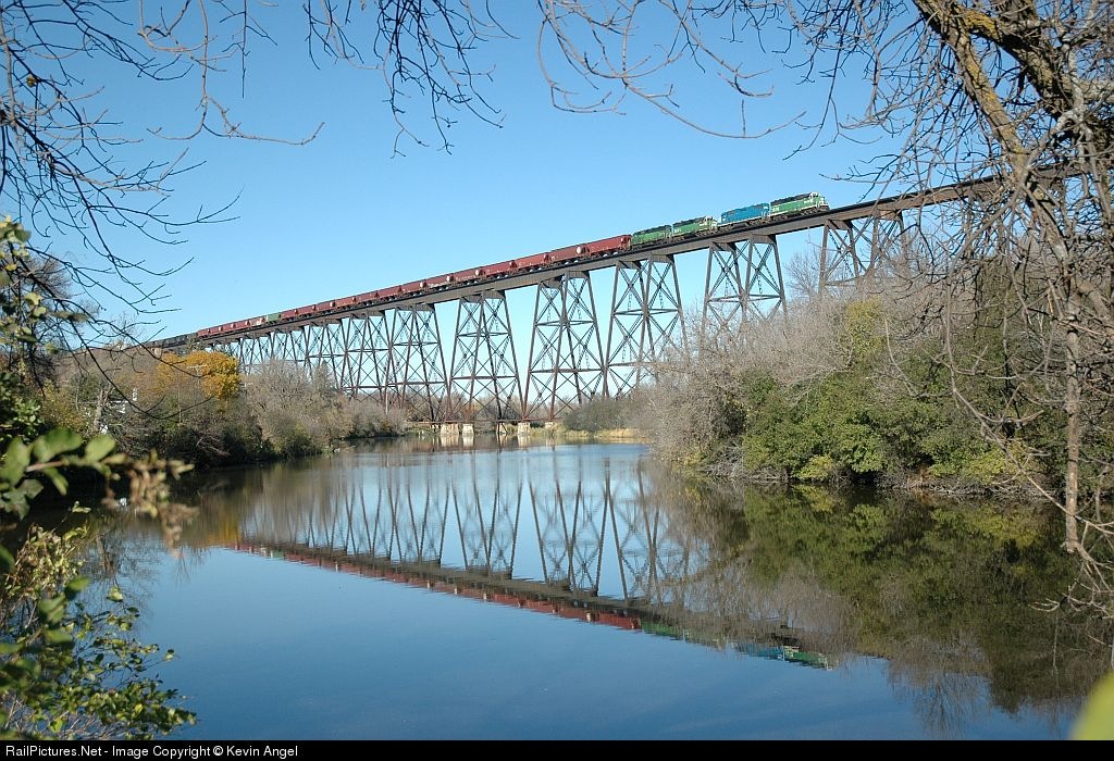 | Eastbound BNSF local with BNSF 1518, EMDX 743, 2871, and 2934 and a few grain cars cross the Valley City treastle (3886 feet long and 155 feet high) |