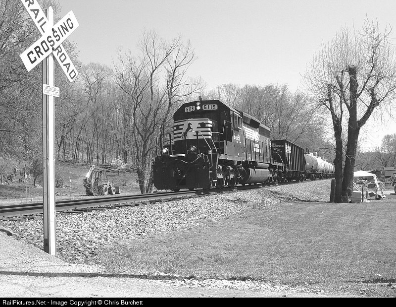 | On this sunny April afternoon, NS SD40-2 No. 6119 leads the 45N, with thirty cars, north through Glouster, Ohio, on the West Virginia Secondary. |