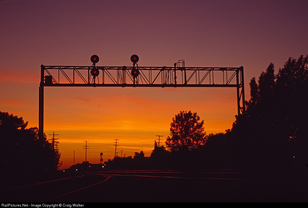 | Burlington Northern Santa Fe signal bridge at Basta, in western Fullerton, California, at sunset on April 25, 1997. |