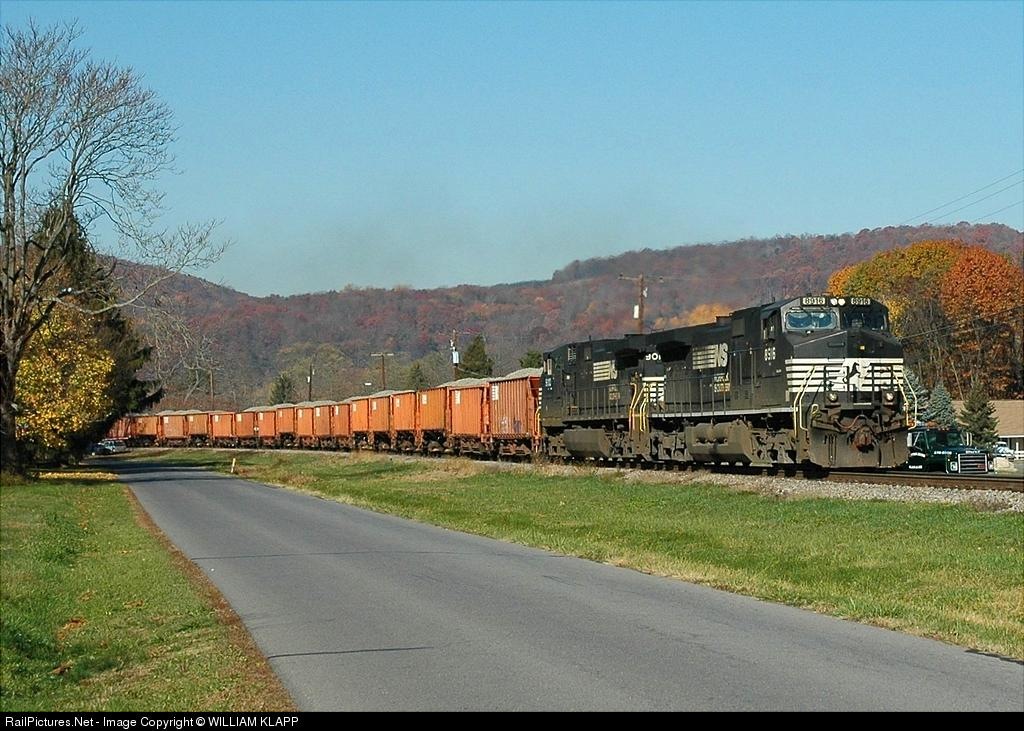 | Northbound in early morning sunlight , Passing fall colors , With A unit ballist train of NS hoppers |