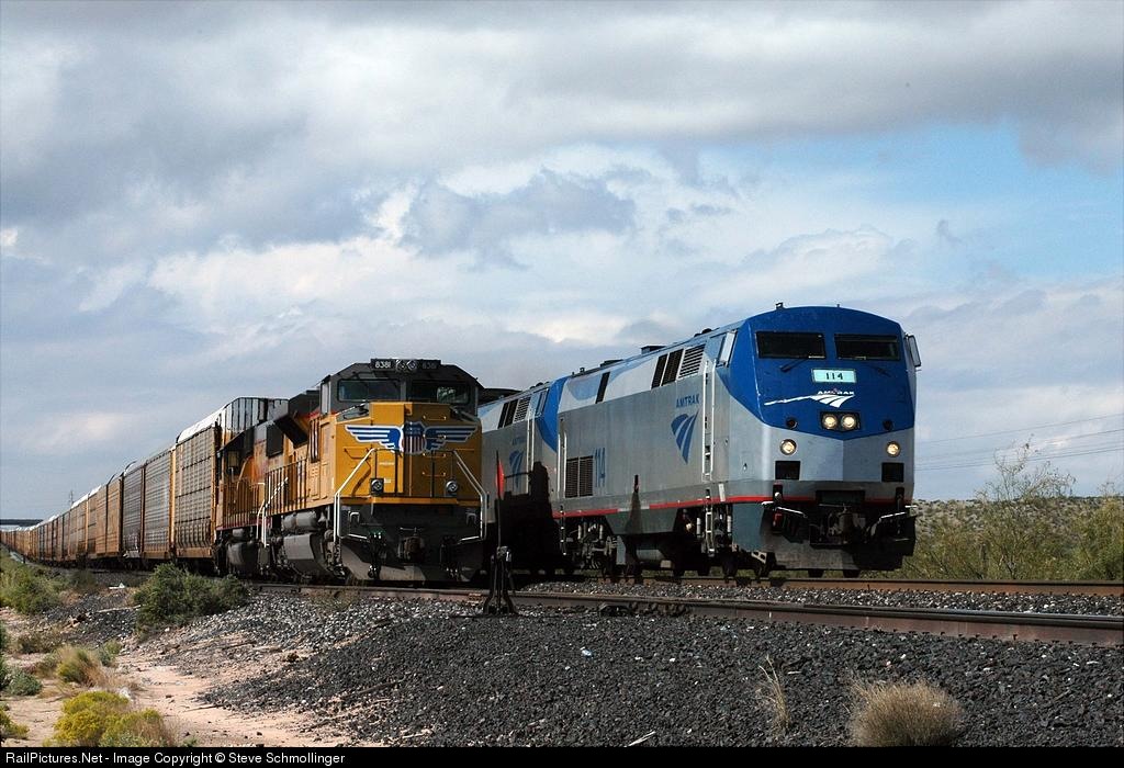 Eastbound Amtrak Sunset Limited runs around an eastboud UP empty autorack train.