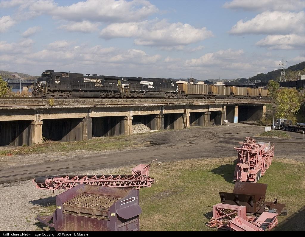 | 8803 leads a northbound coal train at Hays, an interesting section of Pittsburgh where NS, CSX, and the AVR all operate. |