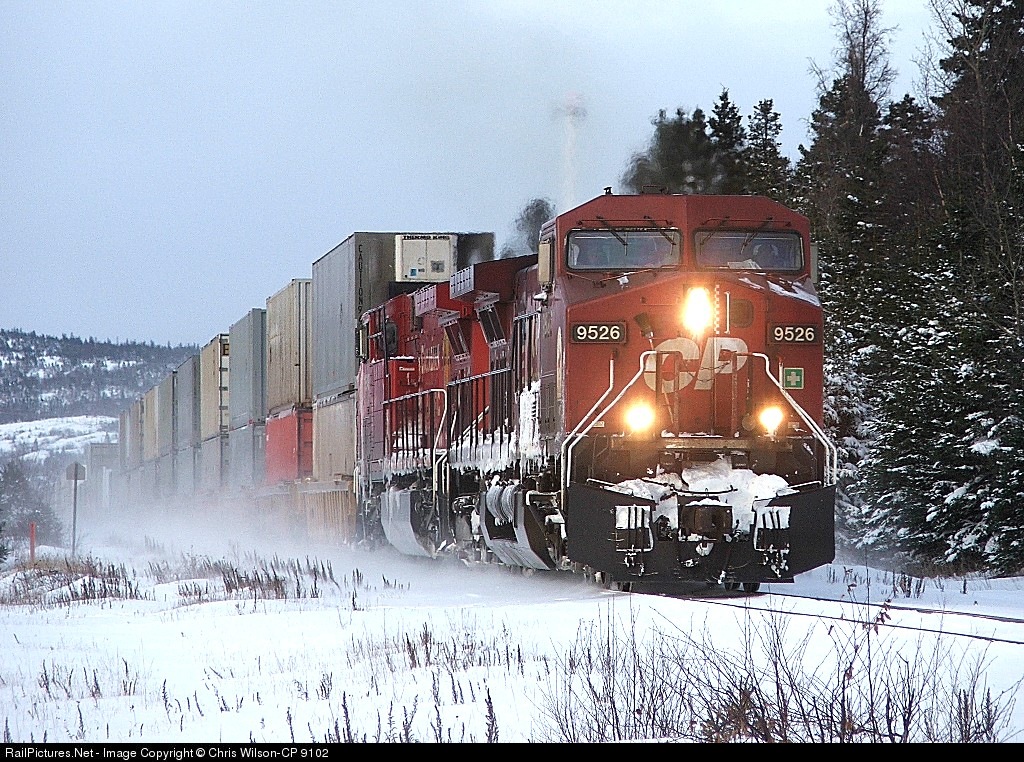 | After getting dumped by a Colorado low we see CP #108-CP 9526, 8548, intermodal, 1 t/e autorack-356 axles @ 16:15 kicking up the snow!