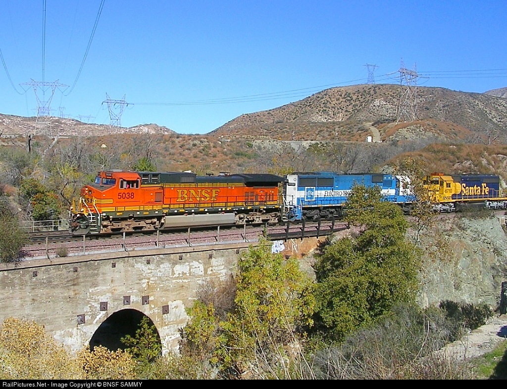 | BNSF 5038 leads a stack train with ex-EMD demonstrator SD60, Oakway 9038, as the second unit, and BNSF 6710 as the third. Nikon Coolpix 3200 |