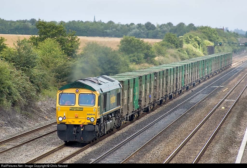 | 66614, 6Z62 09:21 Cricklewood to Calvert containerized rubbish train. Shottesbrooke Farm, Berks. Mon 25 July 2005 |