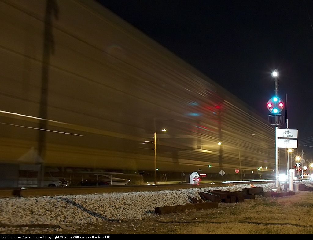 | Wasting no time getting through Carbon Siding, Q247 02 knocks down the the old B&O mast signal as it flies through O'Fallon. Note that the siding has a rare dwarf CPL. Pretty soon, these signals will be history as CSX is in the process of ripping them out |