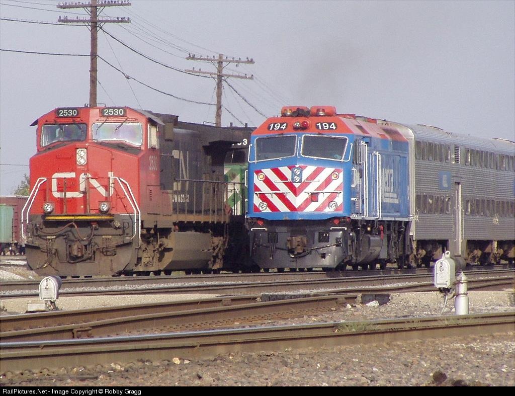 | As Metra 194 heads back to Chicago, CN Dash 9 #2530 and a BN SD40-2, the power from M-BRCGAL, prepare to switch Eola Yard before heading west. |