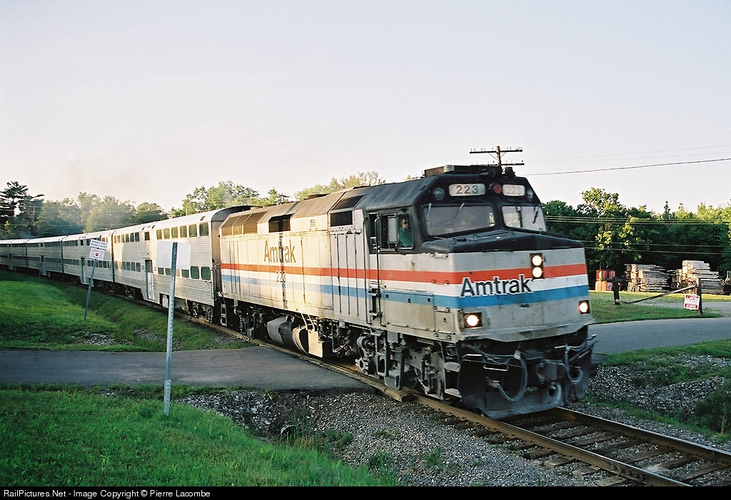 | An AMT commuter train (still wearing Amtrak cs) passing through an unprotected crossing on its way to Montréal. Built about 1977, nee AMTK-223, 3000 h-p. |