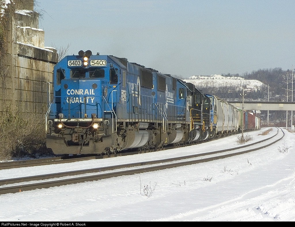 | An all EMD 11A, including a pair of former Conrail SD50's, charge west towards Conway. |