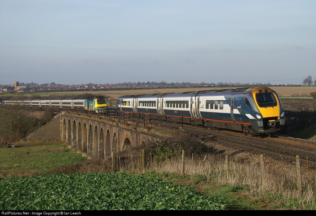 A Class 222 Meridian bound for London St. Pancras passes a northbound Intercity 125(with its rear power car still in old Midland Mainline livery) on 14 arches viaduct just south of Wellingborough.