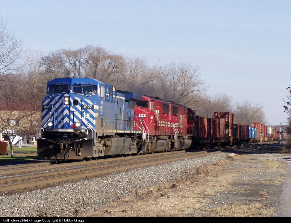 | CEFX Bluebird AC4400CW #1027, SOO SD60M #6059, one of only 5 SOO SD60Ms, and a SOO SD60 lead a westbound stacker through Chesterton. |