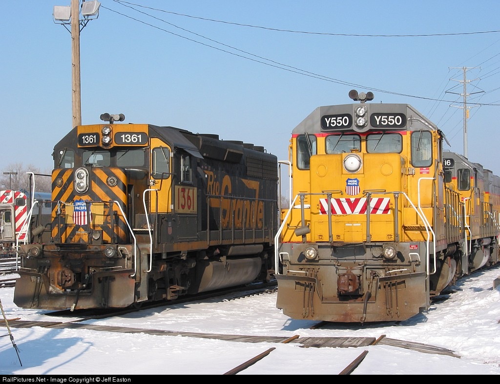 | A tale of two noses. On the right is an ex-CNW with a nose bell. On the left, ex-DRGW with a Gyralight. |