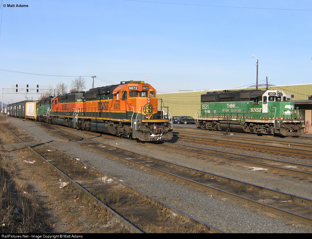 | After dropping off cars for the Portland & Western in the W Yard, BNSF 6872 heads east passing BNSF GP28M 1521 in a special Operation Lifesaver paint scheme. |