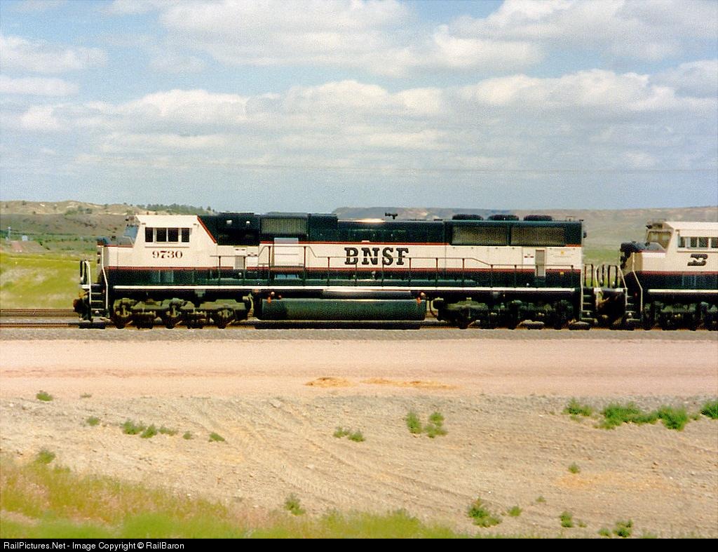 | New BNSF 9730 rolls north at Nacco on the Orin Line in the Powder River Basin in 1997. |