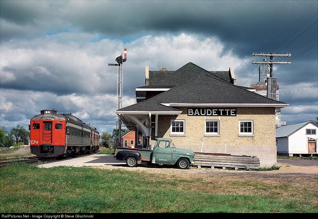 | CN train 687 arrives in Baudette on its westbound trip from Thunder Bay to Winnipeg. The train has just left Canada and will run through the US to Warroad, where it will cross back into Canada. This train was discontinued in 1977. |